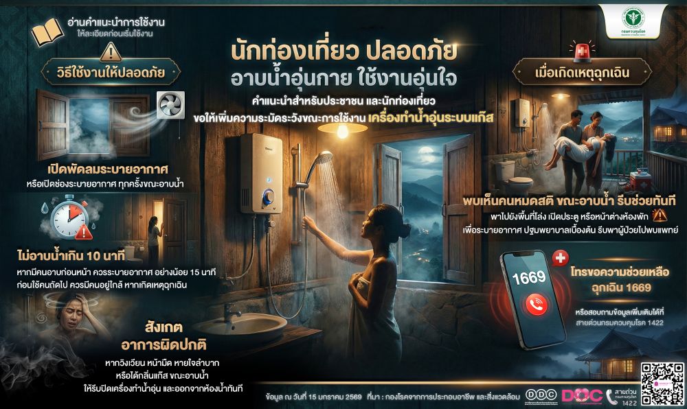 สำหรับเครื่องทำน้ำอุ่นระบบแก๊ส ขอให้ประชาชนเพิ่มความระมัดระวังเป็นพิเศษ ยิ่งเฉพาะกลุ่มเสี่ยง เช่น คนที่เป็นโรคหัวใจ ความดันโลหิตสูง โรคระบบทางเดินหายใจ โดย 1) เปิดพัดลมดูดอากาศหรือช่องระบายอากาศทุกครั้งขณะอาบน้ำ หากไม่มี ให้แง้มประตูหรือหน้าต่างไว้เพื่อให้อากาศถ่ายเท 2) ไม่ควรอาบน้ำนานเกิน 10 นาที 3) หลีกเลี่ยงการอาบน้ำต่อจากผู้อื่นทันที ควรเปิดประตูห้องน้ำระบายอากาศทิ้งไว้อย่างน้อย 15 นาที ก่อนเข้าใช้งาน 4) ควรมีคนอยู่ใกล้ หากเกิดเหตุฉุกเฉิน และ 5) หากมีอาการวิงเวียน หน้ามืด หายใจลำบาก หรือได้กลิ่นแก๊สขณะอาบน้ำ ให้รีบปิดเครื่องทำน้ำอุ่นระบบแก๊ส และออกจากห้องน้ำไปยังที่ที่มีอากาศบริสุทธิ์ทันที ทั้งนี้ กรมควบคุมโรคได้กำชับหน่วยงานในสังกัดและสำนักงานป้องกันควบคุมโรคในพื้นที่ เฝ้าระวังสถานการณ์โรคและภัยสุขภาพในแหล่งท่องเที่ยวและพื้นที่ที่มีประชาชนเดินทางหนาแน่น พร้อมสื่อสารความเสี่ยงและให้คำแนะนำด้านสุขภาพแก่ประชาชนอย่างต่อเนื่อง และขอความร่วมมือประชาชน “เที่ยวอย่างระมัดระวัง ใส่ใจสุขภาพ ป้องกันโรค เลี่ยงฝุ่น PM2.5 และใช้เครื่องทำน้ำอุ่นอย่างถูกวิธี” เพื่อให้การท่องเที่ยวในช่วงอากาศหนาวเย็นเป็นช่วงเวลาแห่งความสุขและปลอดภัย หากมีข้อสงสัยสามารถสอบถามข้อมูลเพิ่มเติมได้ที่ สายด่วนกรมควบคุมโรค 1422