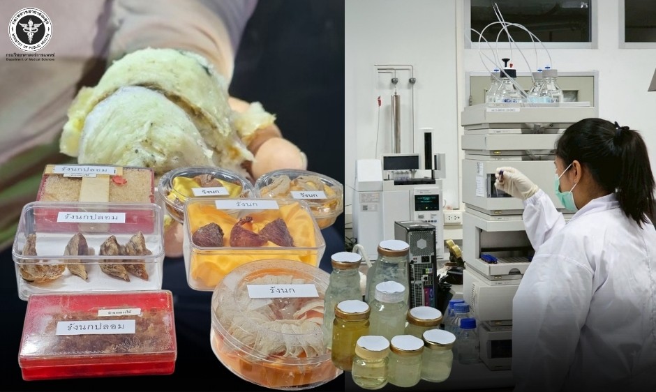 ทั้งนี้ที่ผ่านมาในปีงบประมาณ 2568 กรมวิทยาศาสตร์การแพทย์ได้ให้บริการตรวจเอกลักษณ์รังนก จำนวน 269 ตัวอย่าง แบ่งเป็นวัตถุดิบรังนก จำนวน 29 ตัวอย่าง พบว่าทุกตัวอย่างเป็นรังนกแท้ เมื่อเปรียบเทียบ Infrared spectrum กับรังนกนางแอ่น และเครื่องดื่มรังนกสำเร็จรูป จำนวน 235 ตัวอย่าง พบว่ามีส่วนประกอบของรังนกนางแอ่นในผลิตภัณฑ์ จำนวน 204 ตัวอย่าง (ร้อยละ 87) ไม่มีรังนกนางแอ่นเป็นส่วนประกอบ จำนวน 31 ตัวอย่าง (ร้อยละ 13) ตรวจวิเคราะห์กรดไซอะลิค จำนวน 11 ตัวอย่าง ไม่พบกรดไซอะลิค จำนวน 2 ตัวอย่าง (ร้อยละ 18) พบกรดไซอะลิค ในช่วง น้อยกว่า 0.1-1.63 กรัมต่อกิโลกรัม จำนวน 9 ตัวอย่าง (ร้อยละ 82)